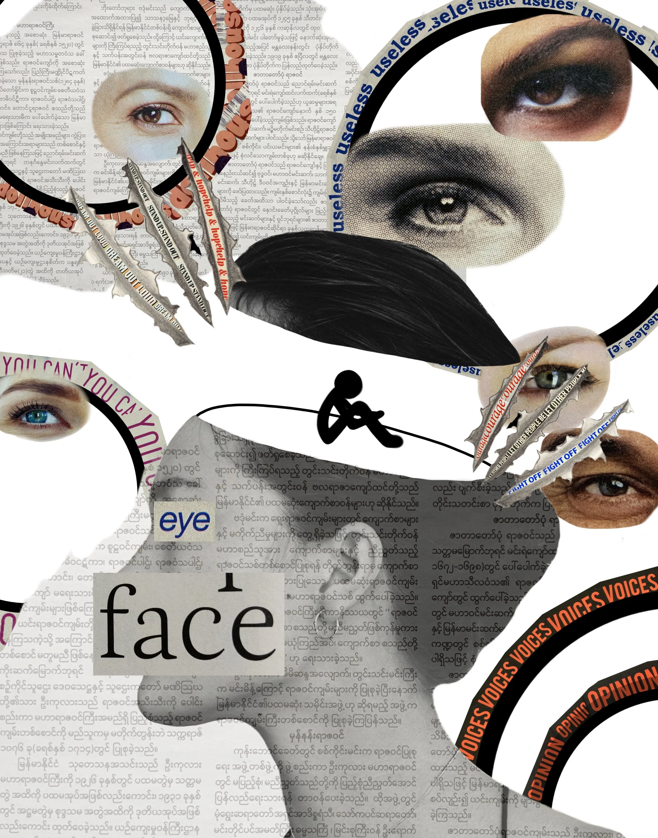 A portrait of my mom made with yarn. The pattern used for the background is commonly known as "chate" and is used as design for Burmese traditional clothing.